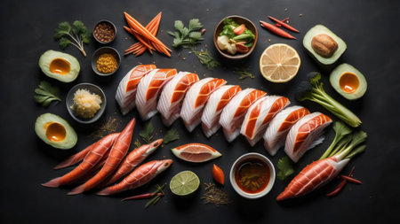 Salmon steak pattern, conceptual salmon background, flat lay composition