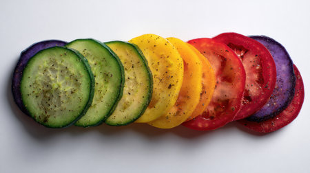 A vibrant assortment of sliced vegetables including cucumber, tomato, and onion arranged neatly with seasoning on a clean white background, perfect for healthy cooking ideas.