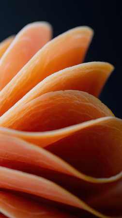 Close-up view of beautifully sliced light ham with appetizing layers that cascade, highlighting its texture and color in a macro setting.