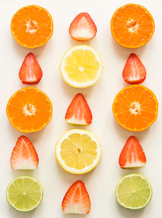 Top view of citrus fuits and strawberiesy, on the white background