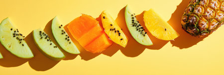 Sliced tropical fruits including pineapples, mangoes, and papayas are artistically arranged on a vivid yellow backdrop, showing summer freshness.