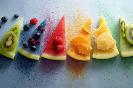 Colorful fruit slices are artistically arranged, sparkling with cheerful energy and wellness vibes, creating a refreshing atmosphere in a bright kitchen.