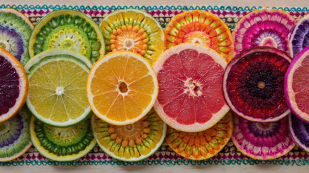 A collection of fruit slices artfully arranged to form colorful mandalas, embodying a fresh and modern yoga-inspired atmosphere