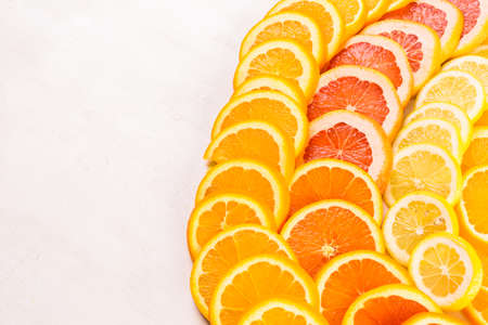 Slices citrus fruits pattern for making cocktail or juice, top view
