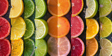 A close-up shot of various citrus fruit slices, halved and arranged in a grid on a black surface with water droplets.