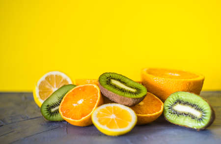 Organic food concept with fresh and ripe kiwi, orange and lemon on concrete background with copy space