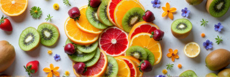 Colorful assortment of sliced fruits with kiwi, orange, strawberry, and flowers. That the image is generated using AI.