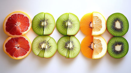 A visually appealing arrangement of vibrant and fresh fruit slices showcases the beauty of nature's bounty. Ideal for themes of nutrition, wellness, and healthy eating.