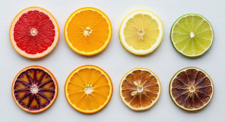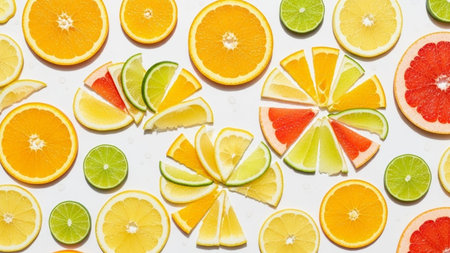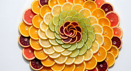Citrus fruit slices arranged in a floral pattern. Colorful and healthy food featuring fresh ingredients and vitamins. A vibrant display of lemons, limes, oranges, and blood oranges. AI Generative AI generated