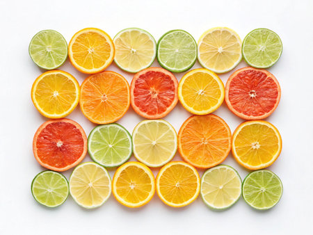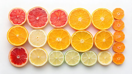Citrus fruit slices on a white background, top view.