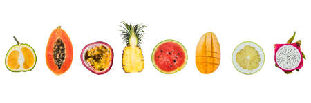A lot of different tropical fruits cut halves isolated on white. long format.