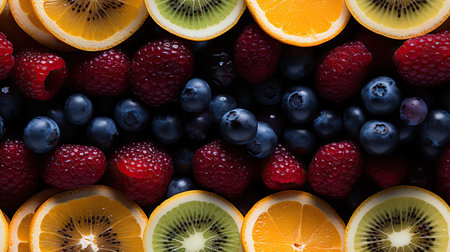 Concept of healthy eating, dieting, top down, flat lay fashionable seamless pattern of sliced mixed citrus fruits like backdrop with various berries. GENERATE AI