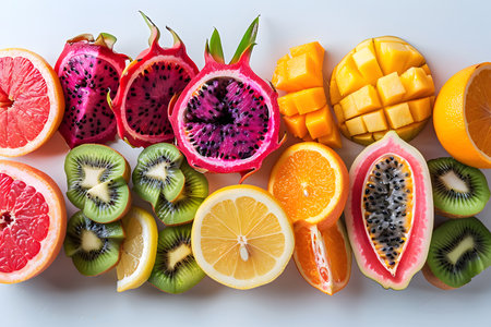 Colorful combination of sliced tropical fruits placed flat on a white surface