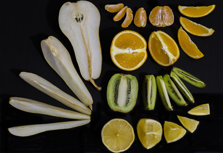 pieces of orange, lemon, kiwi, mandarin and pear