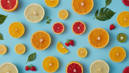 A vibrant flat lay of assorted citrus fruits, strawberries, and kiwi slices with green leaves on a blue surface.