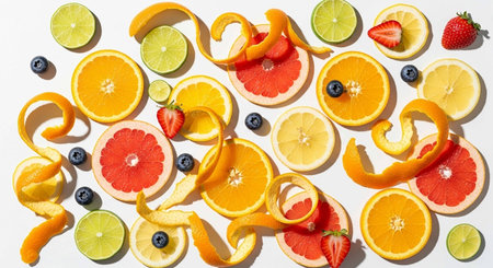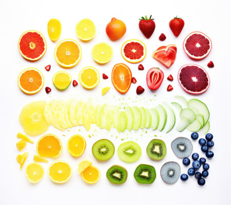 An array of vibrant fruits including orange slices, strawberries, and blueberries are artistically arranged on a clean white background, showing their fresh colors and textures.
