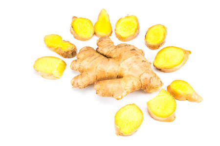Sliced Root of Organic Ginger Natural Antibiotic, Spice and Seasoning over white Background