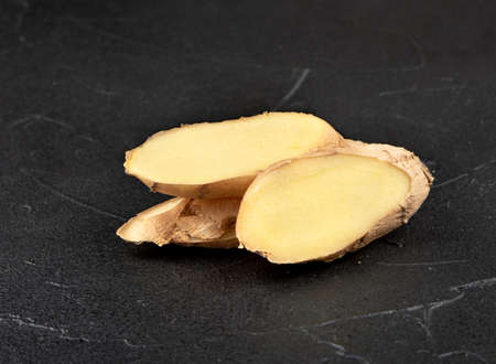 Several slices of fresh ginger root on a dark background