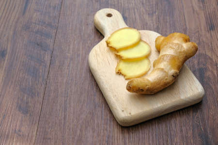Slices of ginger root on wooden board.