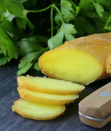 Ginger root - Fresh ginger root and sliced on old plank with nature background. Close-up, Selective focus