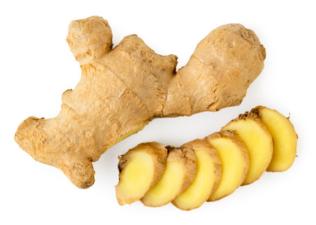 sliced fresh ginger isolated on white background
