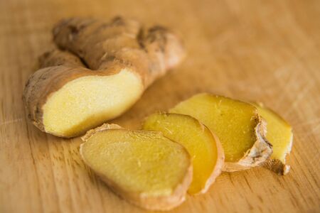 View of ginger slices. Ginger is well known food used in home remedies for flu and boosts immunity