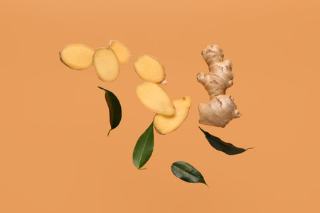 Flying slices of fresh ginger root and leaves on orange background