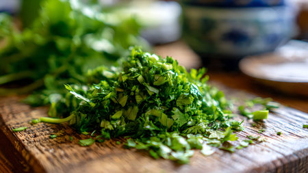 Close-up of freshly chopped cilantro on a rustic wooden cutting board, ready for cooking and adding flavor to dishes.