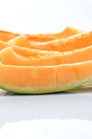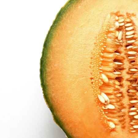 Fresh sweet orange melon on the white plate as a background with a selective focusing. Useful and vitamin-rich food. Vegeterian