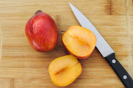 Juicy ripe cut red plum. Vintage wooden background, selective focus