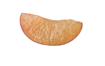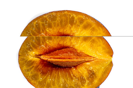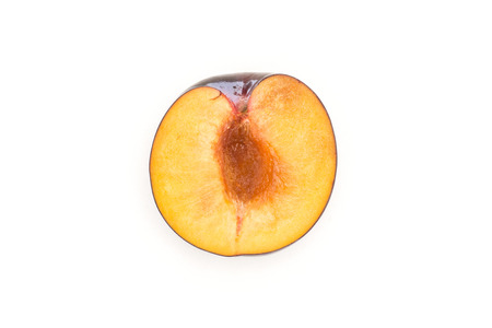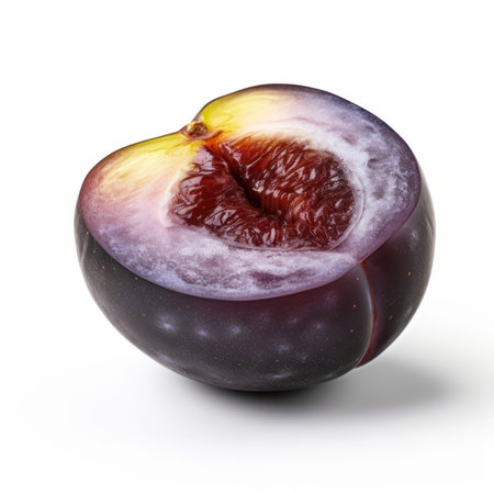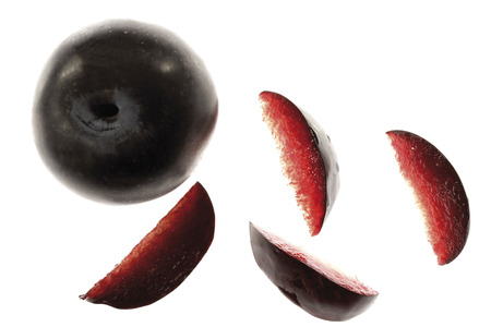 A close up of a plum with a slice taken out of it, art project in primary school, on white background