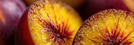 Fresh peach slices showcase juicy yellow flesh and deep red skin