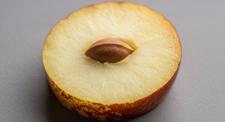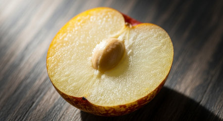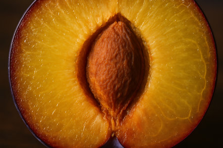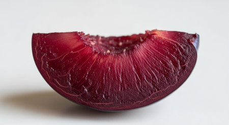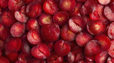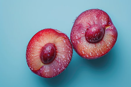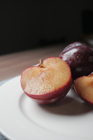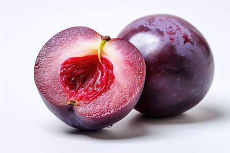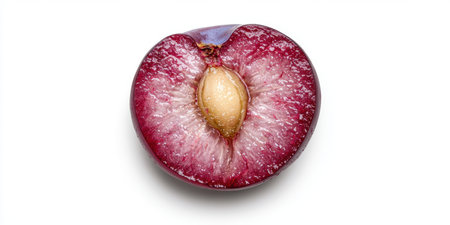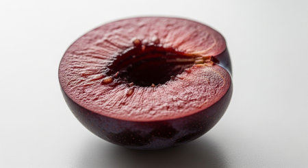 Juicy red plums sliced open revealing vibrant flesh and pit under natural light in a close-up view