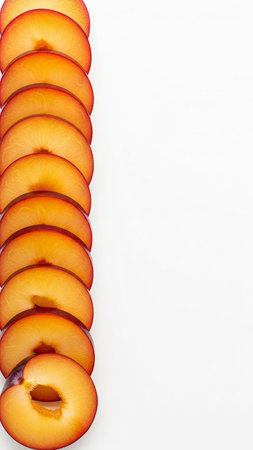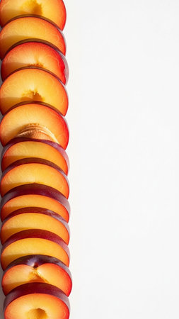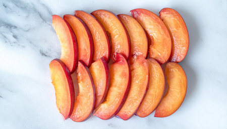 Pluot slices arranged edge up to form a neat serration on cool marble high clarity and low saturation refined fruit still life for editorial and design