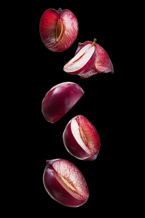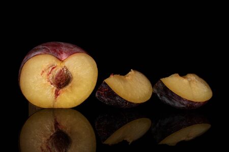 Group of one whole two halves of fresh purple plum isolated on black glass