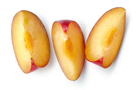 Set of fresh ripe whole, half and sliced plum isolated on white background, top view