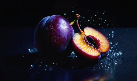 Generative AI, bright slice of juicy ripe plum and water drops, macro of summer fruit