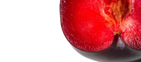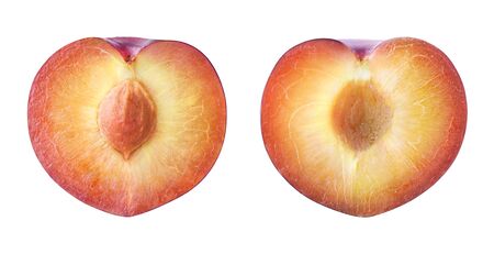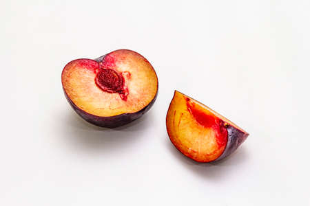 Ripe large purple plums. Fresh whole fruits, half sliced, seeds. Isolated on white background, copy space, close up