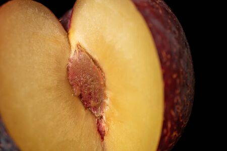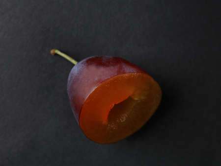 Close up of fresh blue plum fruit cut in half on dark stone background