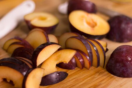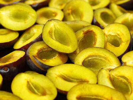 Food background of cutted halfs of blue plums. Top view with selective focus.