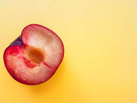 Fresh ripe halved plum showing the golden flesh and stone or pip with a pile of purple plums behind and foreground copyspace.