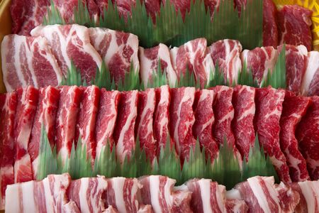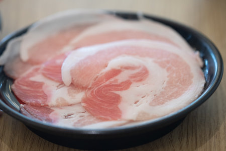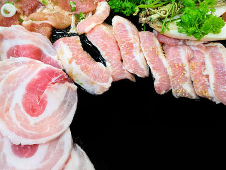 Raw pork on plate, Korean traditional style fresh pork beef belly BBQ, Japanese meat hot pot or Shabu in the restaurant, barbecue food