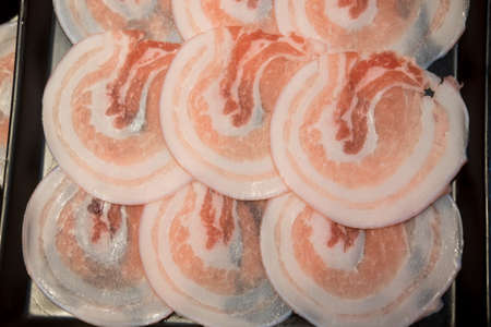 Streaky pork, pork belly cut with skin, fat and meat attached on slice raw pork lined up in dish for shabu-shabu and sukiyaki
