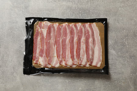 Pack of sliced bacon on gray table, top view