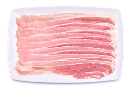 Raw bacon slices isolated on a white background. Top view.