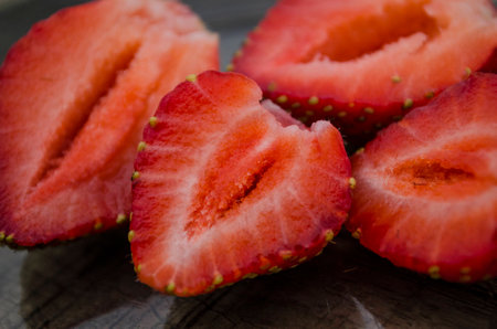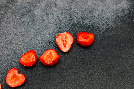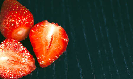 Slices of a fresh red strawberries on a dark wooden table close up. Spring or summer background. Healthy food ingredients theme concept. Image is with copy space.