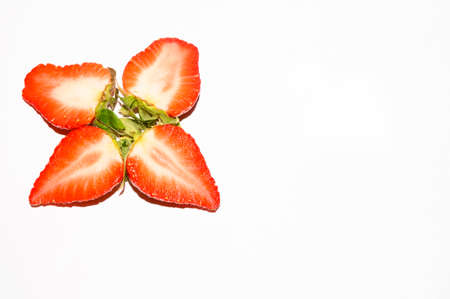 Whole and half ripe strawberry isolated on white background. Sweet fresh summer fruit, healthy food. A modern hard light, dark shadow, top view