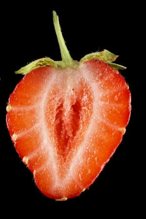 Strawberry close-up on a black background. Macrophotography of cut strawberries. Ripe, fragrant strawberry. Strawberries in natural light and soft focus. Isolated berry.