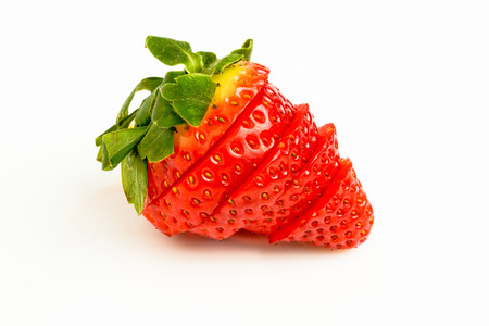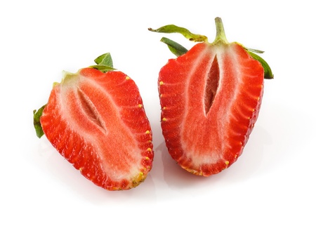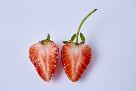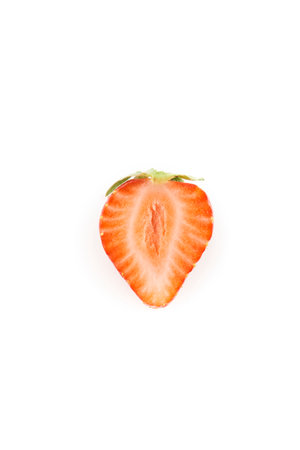Half of ripe strawberry isolated on white background. Single cut or bitten fresh red berry.