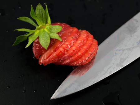 seen from above. On a slate stone background some red strawberries sectioned with an old knife